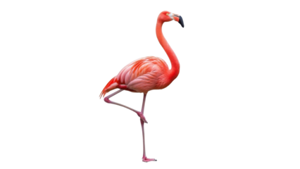 Single Vibrant Pink Flamingo Bird Standing on One Leg in Profile isolated PNG with Transparent Background