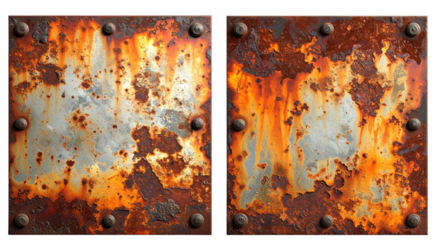 Two rusty, riveted metal plates side-by-side, textured with decay