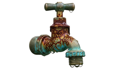 Old rusty faucet PNG isolated on transparent background, vintage water tap with corrosion and water drops, plumbing fixture for design projects