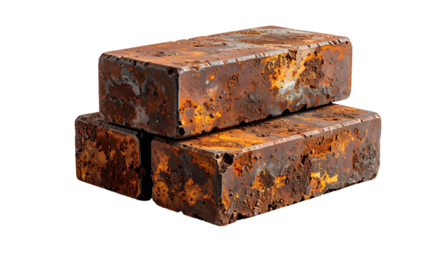 Three rectangular, iron-like blocks with heavily oxidized surfaces, stacked slightly