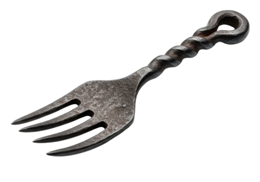 Rustic, hand-forged dark iron dinner fork with well-worn tines, twisted handle, oxidized patina, on transparent background with copy space, studio light. Concept of ancient craftsmanship