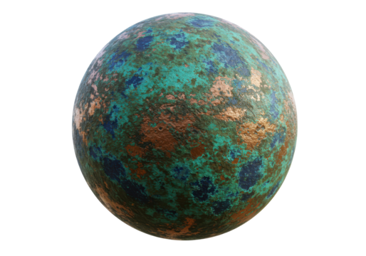 Isolated weathered sphere of tarnished copper and turquoise with rough texture surface art