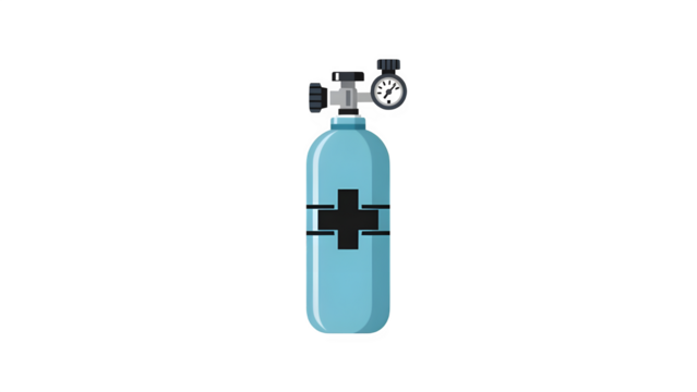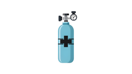 A green oxygen tank with a metal valve and regulator, isolated on a transparent background