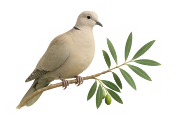 Dove bird standing on an olive branch with green olives, symbolizing peace and nature, transparent background