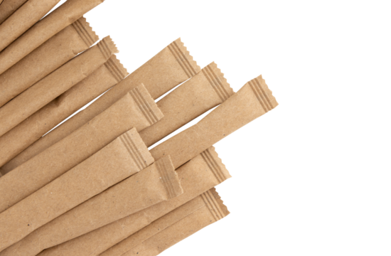 heap of sugar sticks, sugar in paper kraft packaging, mock up for design isolated on white background with clipping path