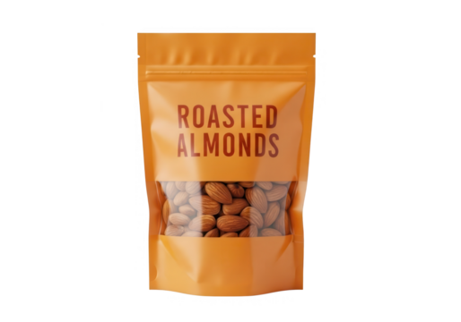 Roasted almonds in an orange stand-up pouch, featuring a clear window, healthy food packaging design.