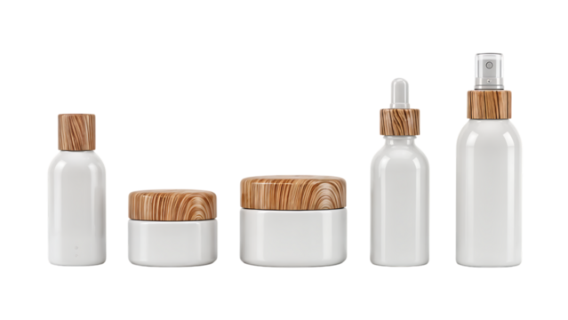 Three soap dispenser bottles with labels isolated on a transparent background