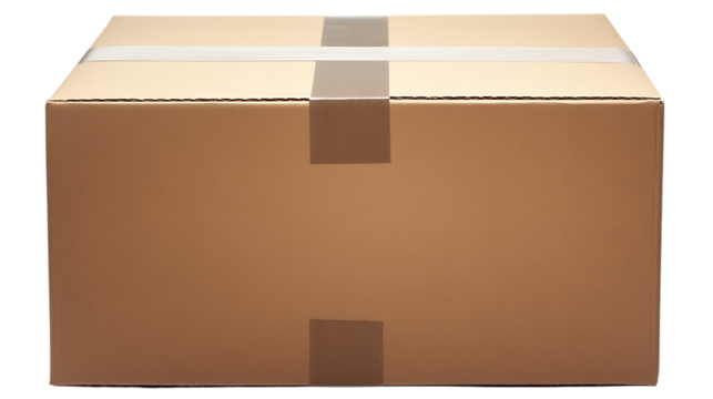 Sealed cardboard box with packing tape sits isolated on white or trasparent png.