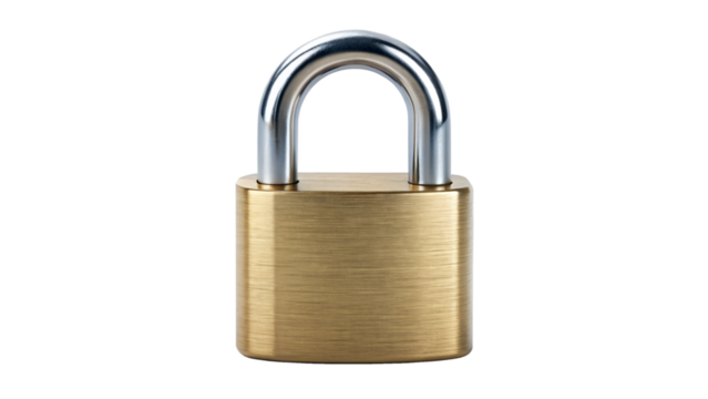 Isolated golden padlock with silver shackle for security, safety, access control or privacy