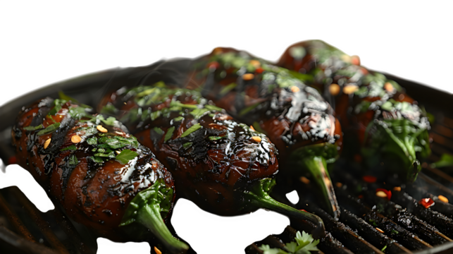 Charred padron peppers in curled cluster, floating PNG, trendy side dish