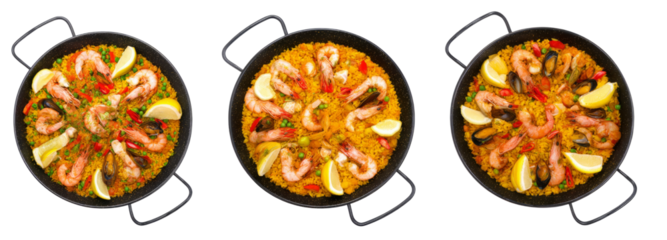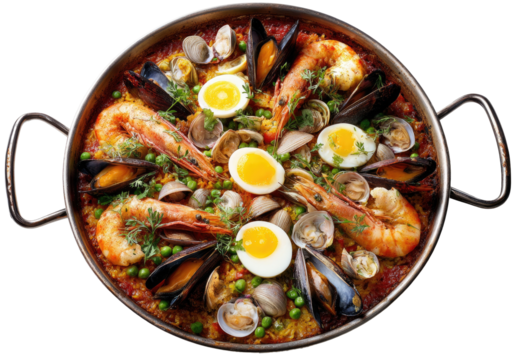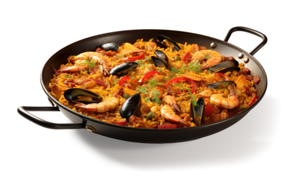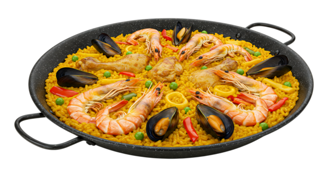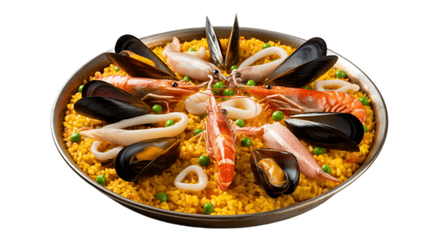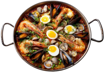 Traditional Spanish seafood paella with shrimp, mussels, and rice served in a pan, isolated on transparent background. Ideal for food menus and culinary promotions.