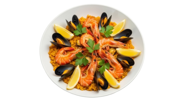 Delicious steaming hot paella with prawns, mussels, clams and lemon, isolated on transparent background
