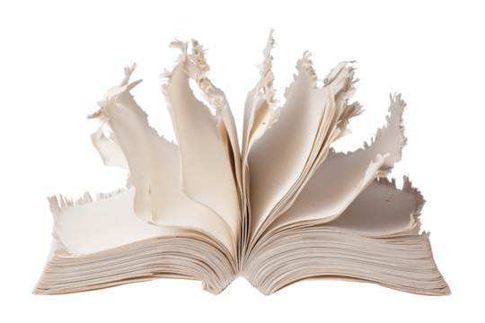 Open book, pages flipping at an angle, on white background. Modern hardcover with yellowed paper, symbolizing education, knowledge, and wisdom. Concept of study, university, and history. Isolated,.
