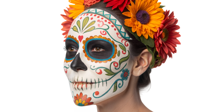 Woman with sugar skull face paint and flower crown for day of the dead celebration portrait view png on transparent background