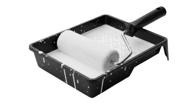 Blue paint roller tray with roller for painting walls and ceilings isolated on transparent background