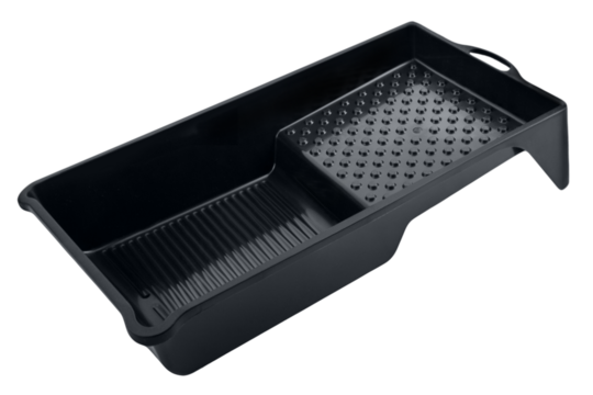 Clean black paint tray with ribbed roll-off area, isolated on transparent background, ready for painting projects