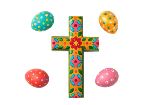 Colorful decorative cross with painted eggs Easter celebration arrangement, isolated on a transparent background