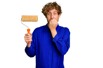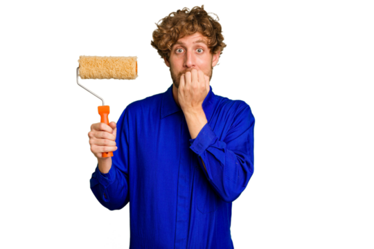 Young painter man holding a roll isolated on white background biting fingernails, nervous and very anxious.