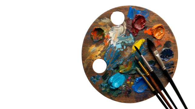 Wooden art palette with colorful oil paint blobs and a paintbrush, isolated on transparent background. Art, Creativity, Painting.