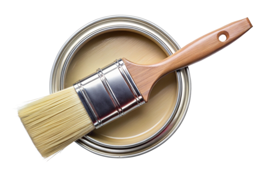 Smiling painter with roller and paint can wearing hard hat on transparent background