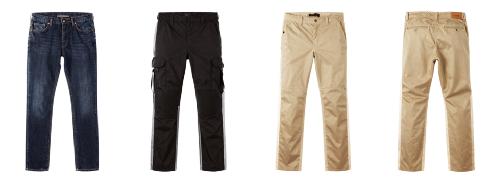 Four pairs of pants: dark blue jeans, black cargo pants, beige khakis, tan cargo pants, all laid flat.