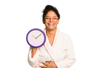 Young brazilian woman wearing a pajama holding a clock isolated relaxed thinking about something looking at a copy space.