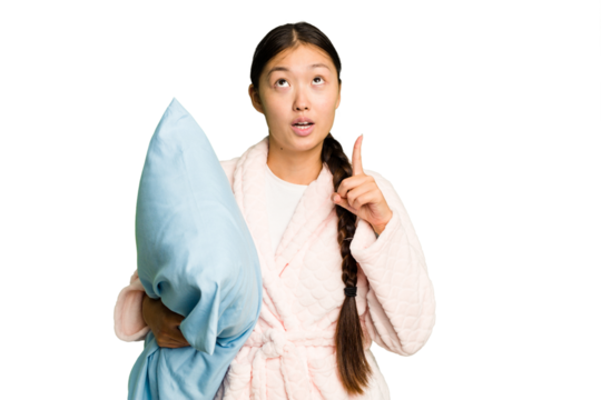 Young asian woman wearing a pajama holding a pillow isolated pointing upside with opened mouth.