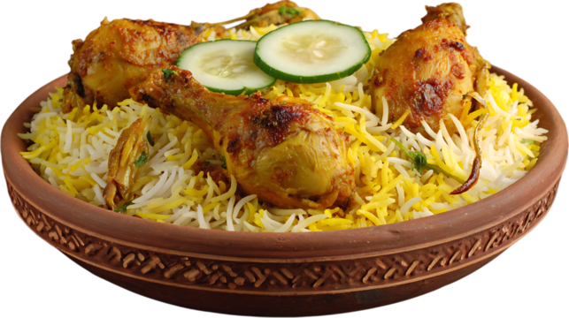 Delicious chicken biryani in clay bowl isolated on transparent background