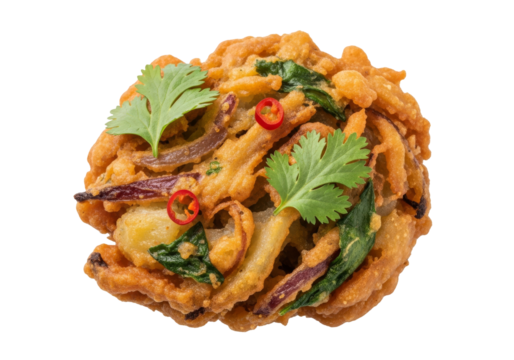 Golden Crispy Indian Bhajiya or Pakora Fritters topped with Red Onion and Curry Leaves Isolated Product Shot isolated on Transparent Background