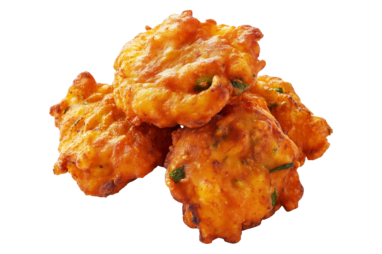 Crispy golden vegetable Indian fritters Pakoras with herbs, isolated on white transparent background, concept of traditional snack