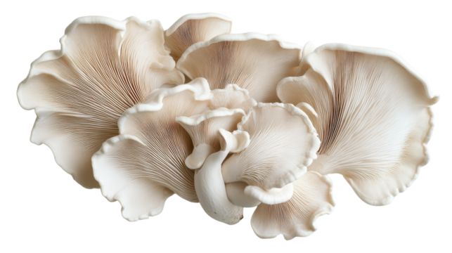 A group of oyster mushrooms with soft, wavy caps in a pale beige color, arranged elegantly on a white background.