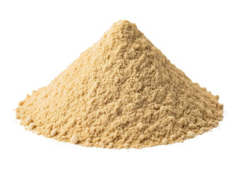 A small, perfectly formed mound of light beige or pale brown ginger powder, white background isolated