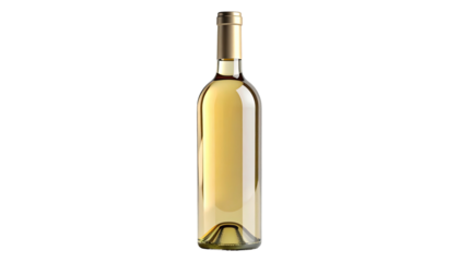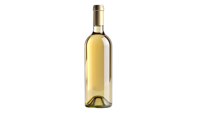 A tall, slender glass bottle filled with pale amber liquid, gold foil top, isolated on black