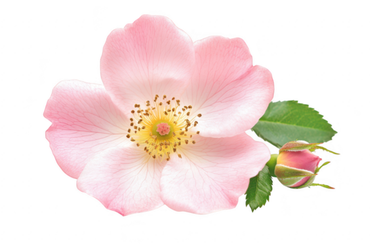 Delicate pale pink wild rose blossom with bud and green leaves isolated on transparent background