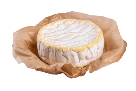 Round Cheese Wheel On Brown Paper, Creamy Texture, Pale Yellow Center On Transparent Background
