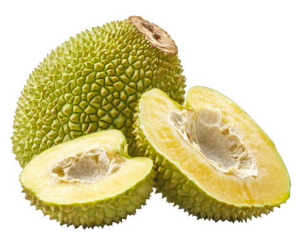 Exotic whole and sliced Durian fruit featuring its thorny rind and pale pulp on transparent background