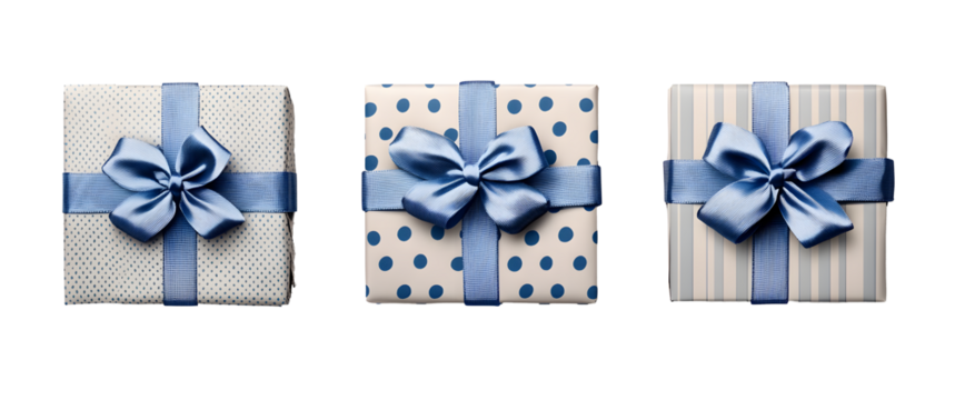 Top view of Christmas, birthday or valentine presents decorated in pale blue spots and stripes with a blue ribbon bow isolated against a transparent background.