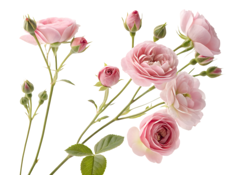 Delicate pale pink english roses with buds and green leaves arranged artfully on a clean transparent background isolated on transparent background
