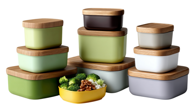 Modern Food Storage Containers: A vibrant ensemble of contemporary food storage containers, with minimalist wooden lids and diverse color palettes, neatly stacked.