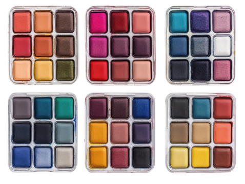 Two open makeup palettes with colorful eyeshadows and a lip gloss tube isolated on transparent background