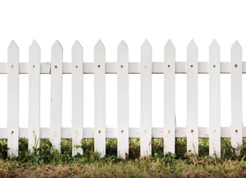 White picket fence isolated on transparent background, PNG. White wooden picket fence