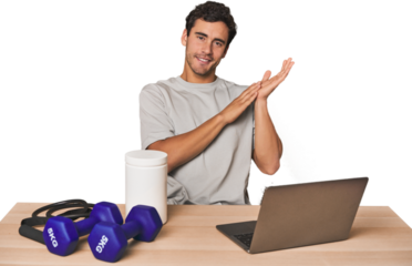 Hispanic trainer planning workout feeling energetic and comfortable, rubbing hands confident.