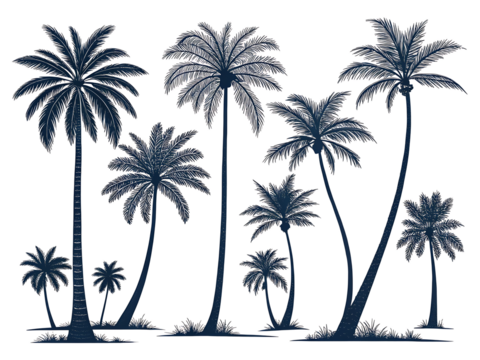 Tropical palm tree assortment on transparent background showcasing coconut phoenix and fan palms for landscape designs and summer themed projects highlighting exotic vegetation and holiday vibes,