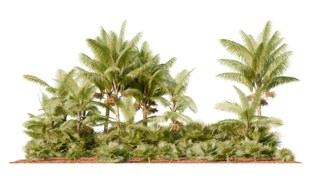 High tropical palm trees with lush green fronds and small ground palms beneath, isolated cutout for tropical architecture rendering