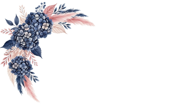 Luxury hand painted floral corner design with hydrangeas and pampas grass in navy and blush pink isolated on white background