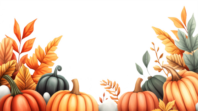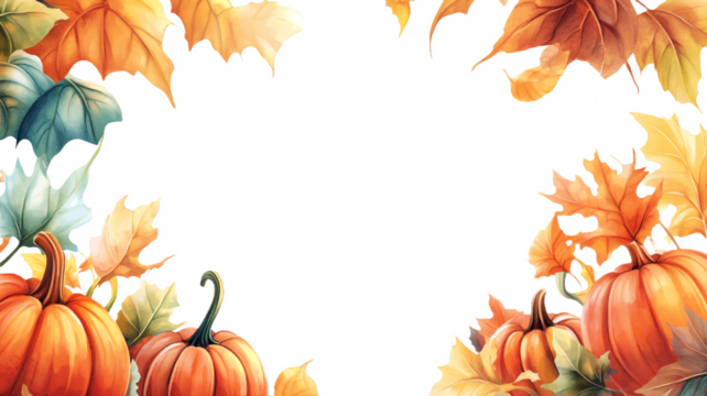Frame of watercolor pumpkins and autumn leaves with transparent background. PNG template for autumn posters, Halloween and Thanksgiving cards with space for text
