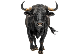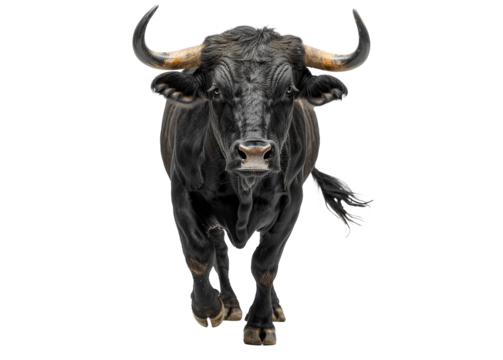 Primer plano de un toro de lidia español de color negro con grandes cuernos caminando y mirando a cámara, sobre fondo blanco transparente