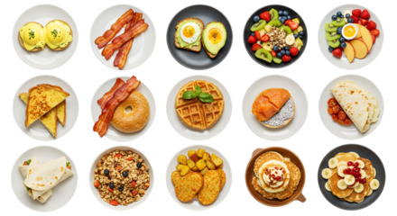 A vibrant breakfast spread featuring various dishes including eggs, bacon, fruits, and pancakes on white plates