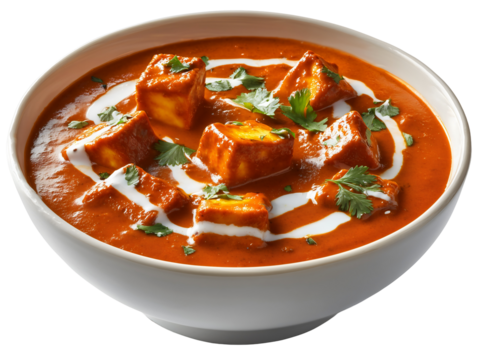 Paneer tikka masala indian curry in rich creamy tomato sauce garnished with cilantro and cream drizzle served in white bowl isolated on transparent background.
