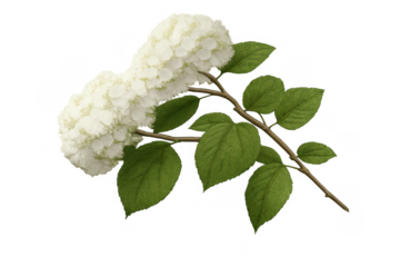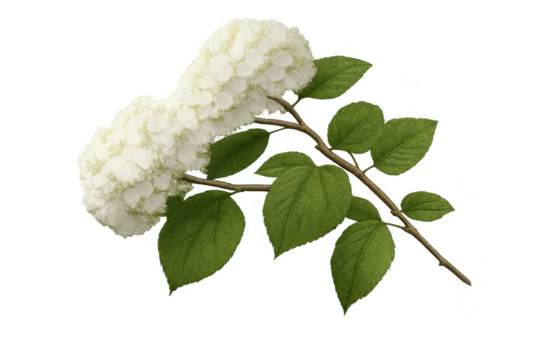 White panicle hydrangea blooming with lush green foliage, isolated on a transparent background, depicting nature and botanical beauty